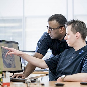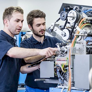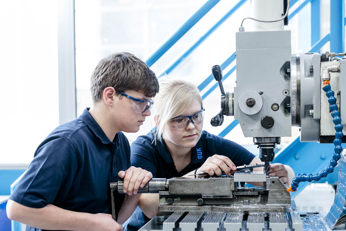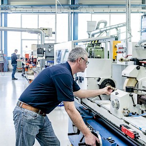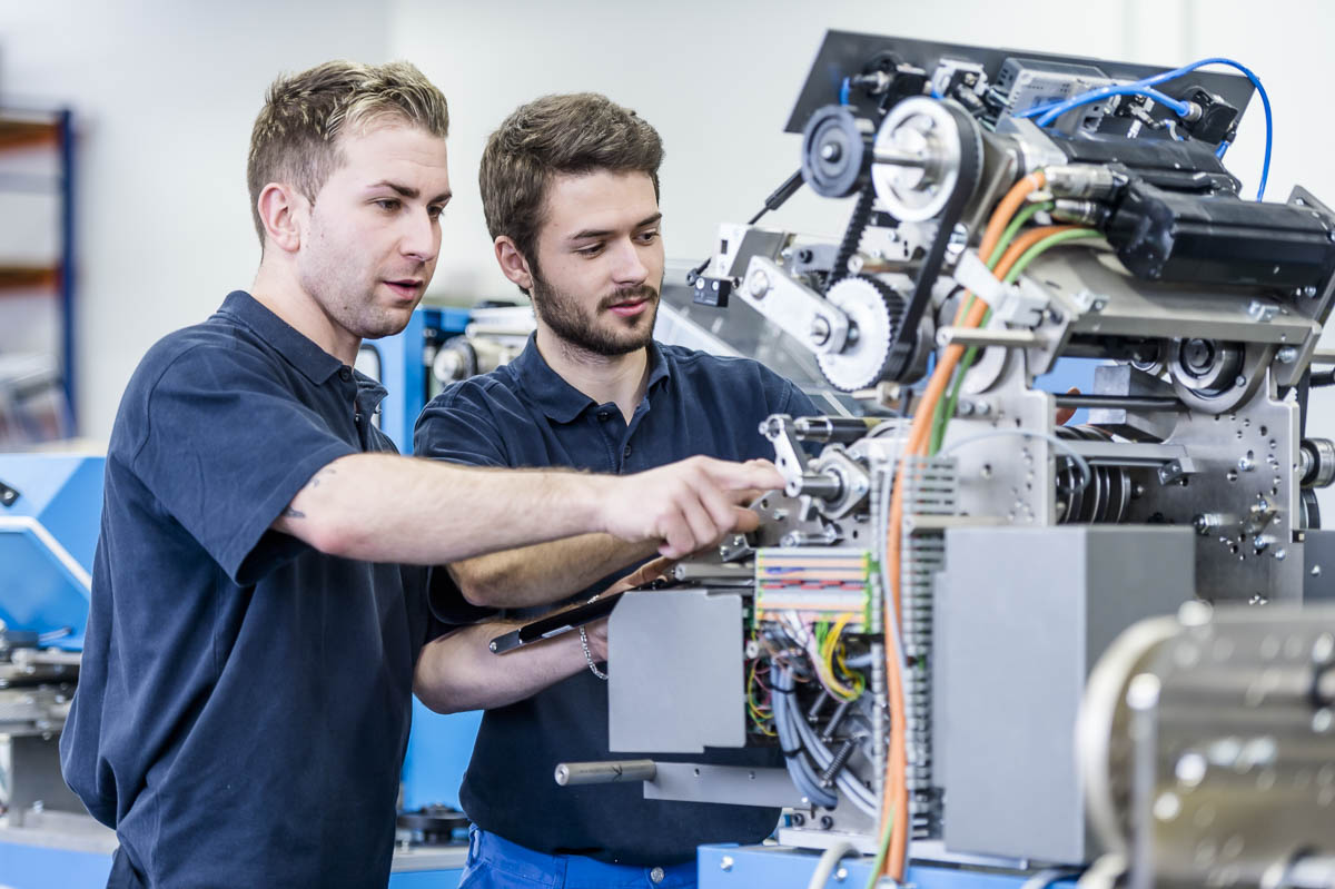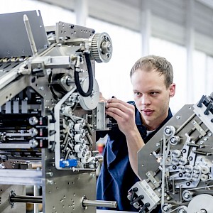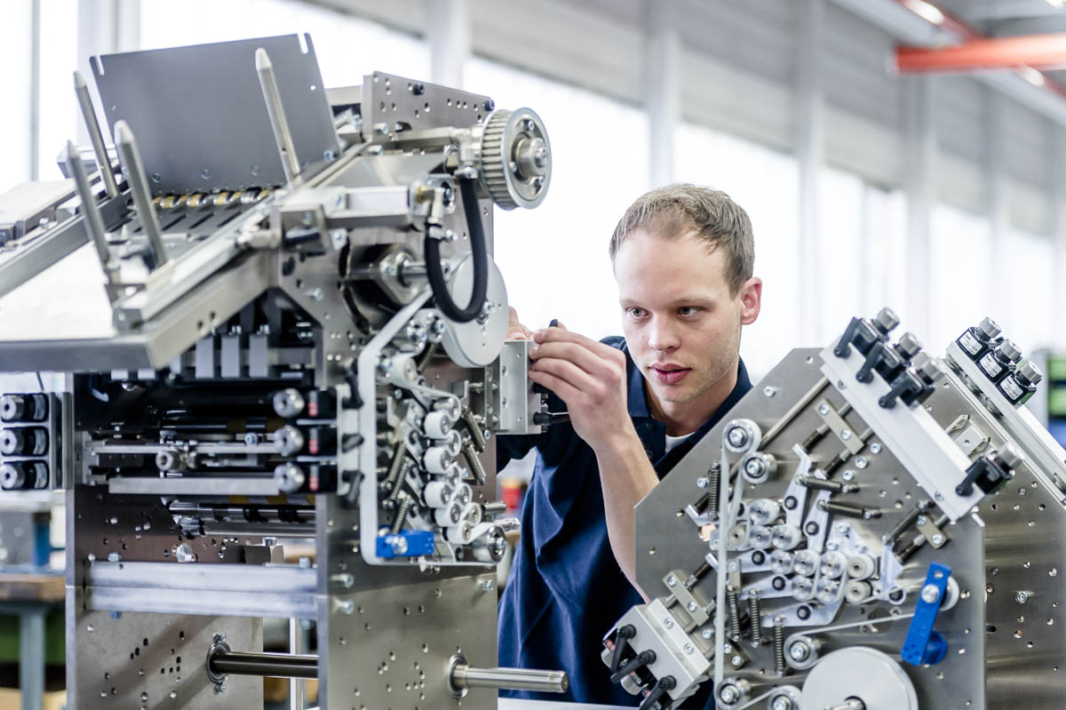 Das heißt aber nicht, dass bei GUK Falzmaschinen keine Innovationen zu Hause sind. Im Gegenteil: Durch den engen Kontakt zu den Kunden hat die Firma einen besonderen Weitblick für die Aufgaben von morgen. Davon gibt es reichlich und so investiert GUK Falzmaschinen nicht nur in die Kapazitäten, sondern auch in die Mitarbeiter der Zukunft – ganz traditionell mit einer innerbetrieblichen Ausbildung. Die Lehrwerkstatt ist dafür unmittelbar in die Fertigung integriert und an der Wertschöpfung beteiligt. So landet das Lehr-Werkstück nicht als Bastelei in der Vitrine, sondern ist Teil einer Maschine irgendwo auf der Welt. Vielleicht sogar auf den Fidschi-Inseln, denn bis dorthin exportiert das Unternehmen. Was für eine Perspektive!